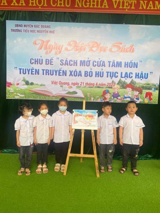 Hưởng ứng Ngày sách và văn hóa đọc Việt Nam, Chiều ngày 21/4/2023 Trường Tiểu học Nguyễn Huệ tổ chức Ngày hội đọc sách năm 2023 với chủ đề: " Sách mở cửa tâm hồn " - Tuyên truyền xóa bỏ hủ tục lạc hậu, gồm các nội dung: Thi tô tranh, vẽ tranh; thi kể chuyện theo sách; thi tiểu phẩm "Tuyên truyền xoá bỏ hủ tục lạc hậu. Ngày hội đã thu hút các bậc phụ huynh và các em học sinh tham gia các hoạt động sôi nổi, hào hứng. Đặc biệt là phần thi " Tuyên truyền xóa bỏ hủ tục lạc hậu" của học sinh lớp 5 đã mang đến nhiều kiến thức bổ ích, dí dỏm qua các tiểu phẩm. Đồng thời, các tiểu phẩm đã gửi đến các bậc phụ huynh, nhân dân trên địa bàn Thông điệp: Quyết tâm xóa bỏ hủ tục, phong tục, tập quán lạc hậu, xây dưng nếp sống văn minh. Kết thúc nhà trường đã trao các giải nhất, nhì, ba, khuyến khích động viên học sinh.